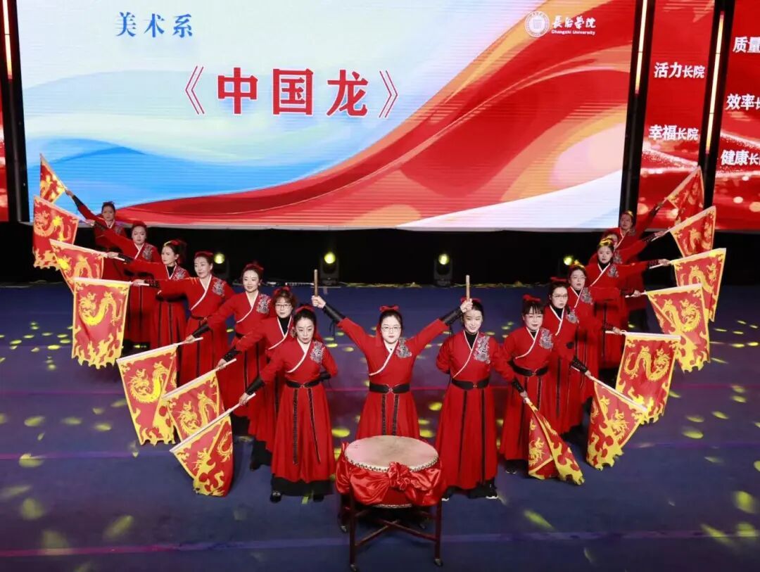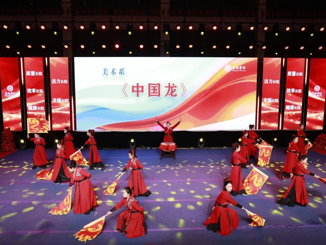 红装似火映赛场,龙旗招展舞豪情。美术系女教师们巧妙糅合艺术韵味与运动活力,每一个精准的摆臂、每一次有力的跳跃,都将《中国龙》的磅礴气场渲染到极致,台下喝彩连连,掌声经久不息。