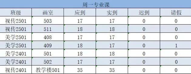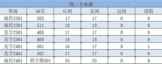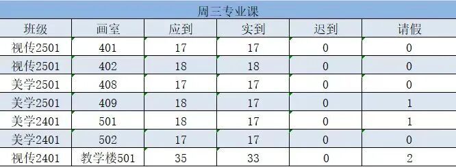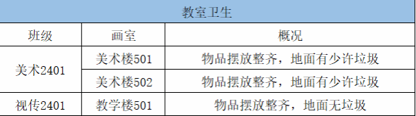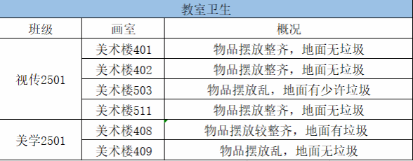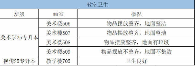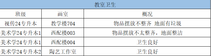 为进一步夯实我系学风建设基础,引导学生树立严谨的时间观念、锤炼优良的学习作风,美术系团委纪检部针对各班专业课出勤情况及教室卫生情况开展了全面核查与统计工作,现将检查结果公示如下。