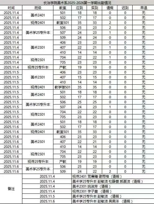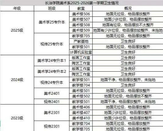 为进一步夯实我系学风建设基础,引导学生树立严谨的时间观念、锤炼优良的学习作风,美术系团委纪检部针对各班专业课出勤情况及教室卫生情况开展了全面核查与统计工作,现将检查结果公示如下。
