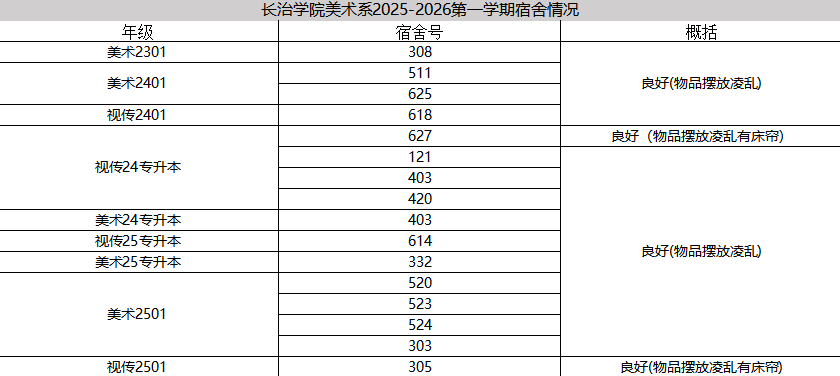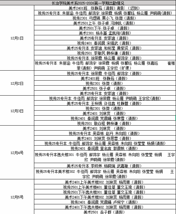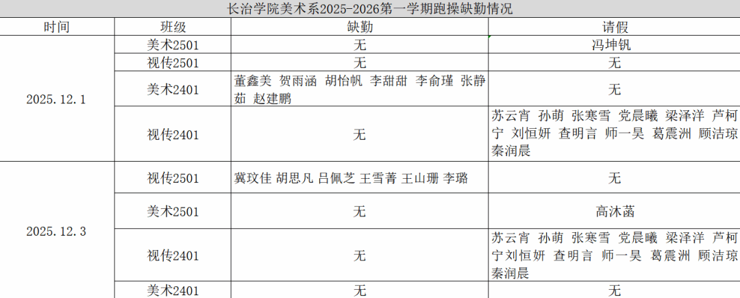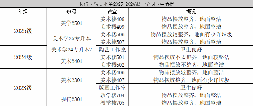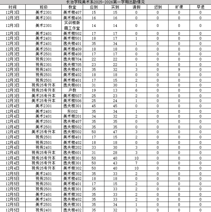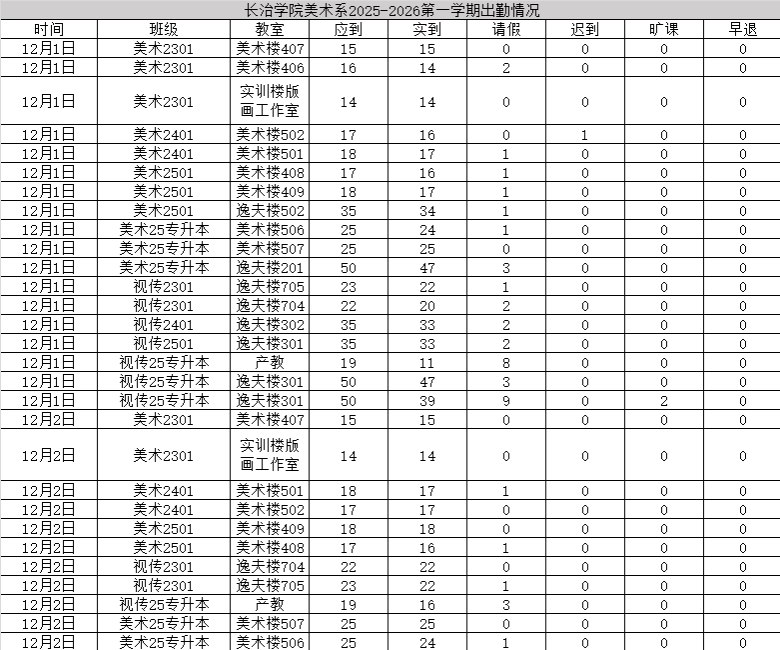 为进一步夯实我系学风建设基础,引导学生树立严谨的时间观念、锤炼优良的学习作风,美术系团委纪检部、学习部联合开展专项检查工作,重点核查统计各班上课出勤、教室卫生及宿舍情况,团委同步开展跑操情况检查,现将全面检查结果公示如下。