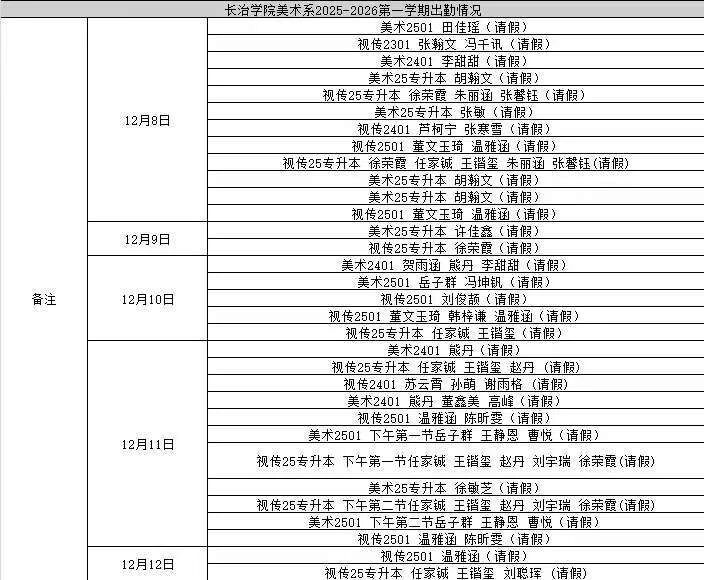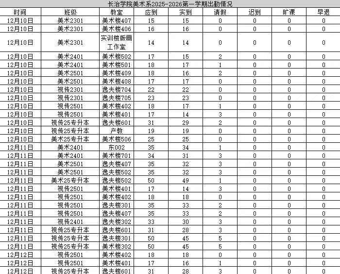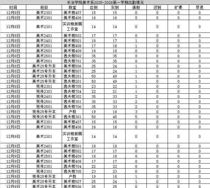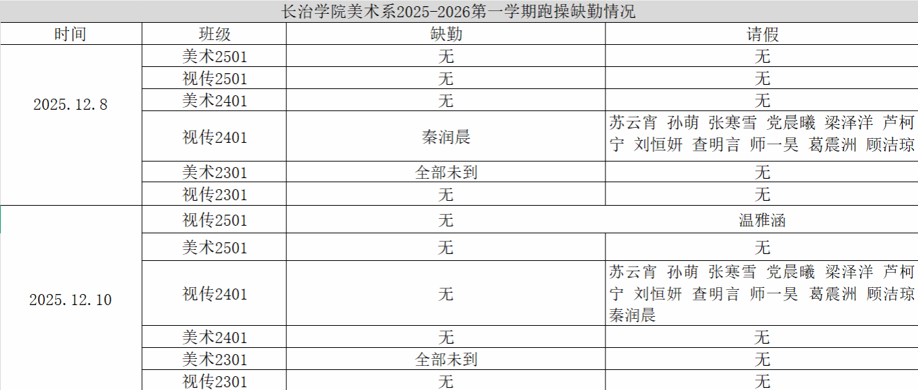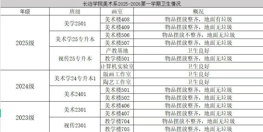 为进一步夯实我系学风建设基础,引导学生树立严谨的时间观念、锤炼优良的学习作风,美术系团委纪检部、学习部联合开展专项检查工作,重点核查统计各班上课出勤、教室卫生及宿舍情况,团委同步开展跑操情况检查,现将全面检查结果公示如下。