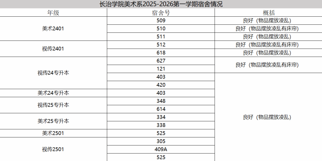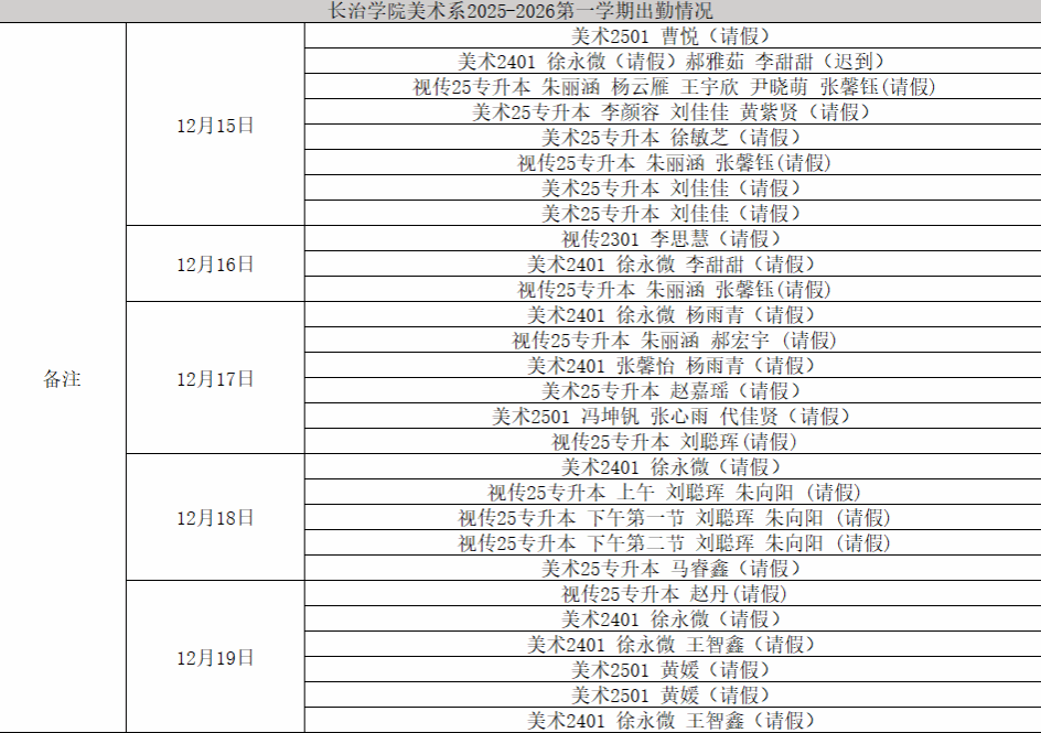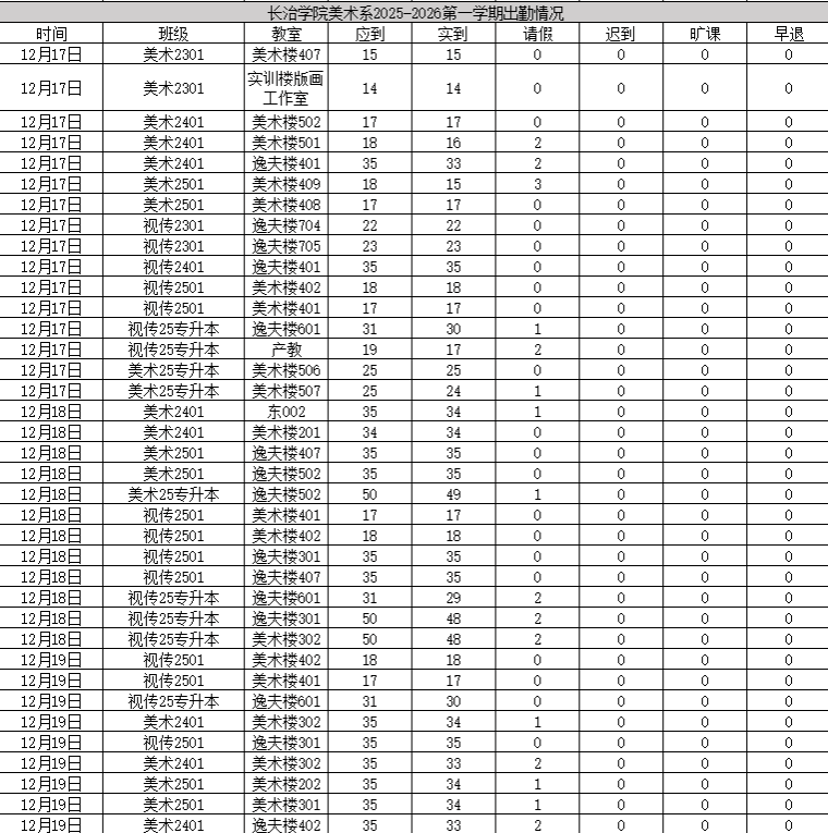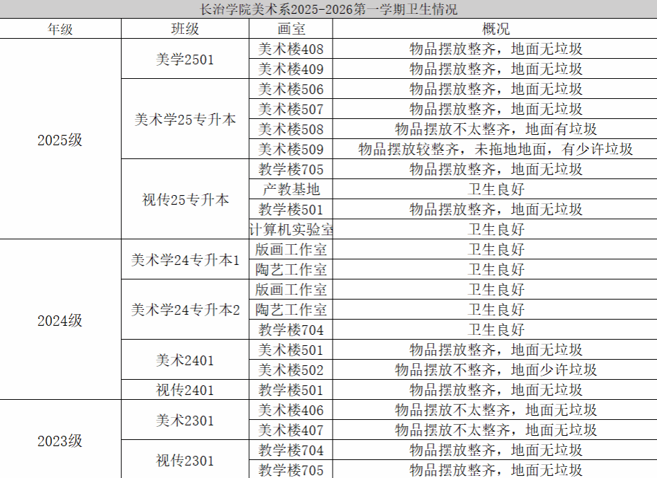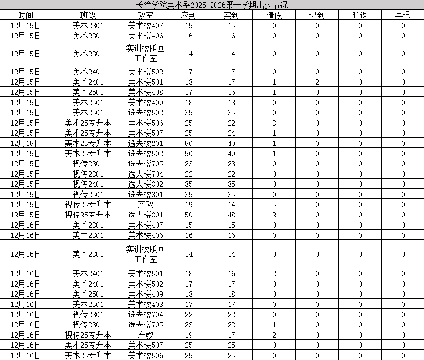 为进一步夯实我系学风建设基础,引导学生树立严谨的时间观念、锤炼优良的学习作风,美术系团委纪检部、学习部联合开展专项检查工作,重点核查统计各班上课出勤、教室卫生及宿舍情况,团委同步开展跑操情况检查,现将全面检查结果公示如下。