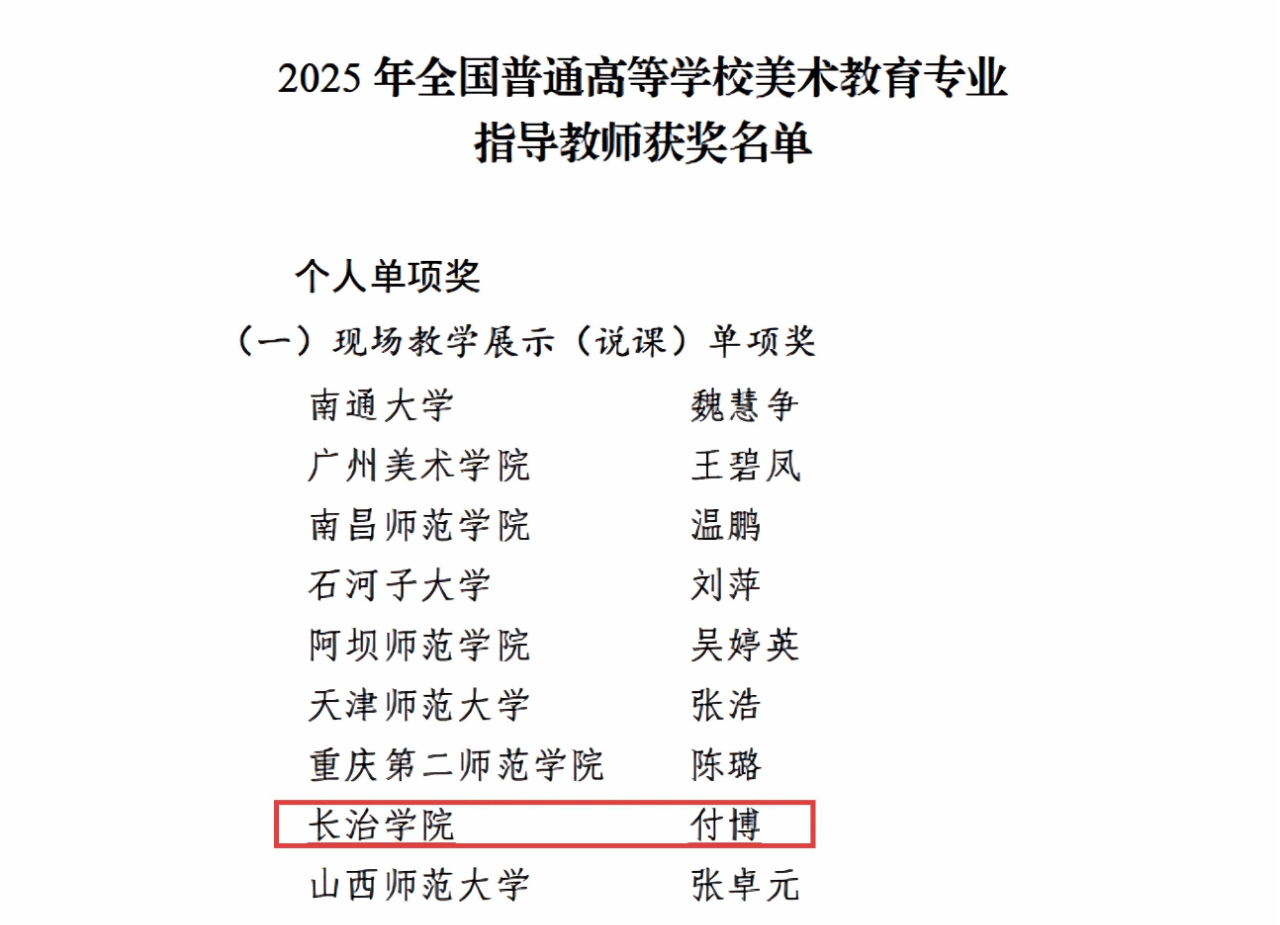 此次获奖,不仅是付博老师个人教学能力的有力彰显,更是我系美术教育专业教学质量与师资队伍建设成果的集中体现。长期以来,长治学院美术系始终坚守“崇德尚艺、笃学敏行”的系训要求,聚焦师范生培养核心目标,不断强化师资队伍教学能力提升,为打造高素质专业化美术教育人才队伍筑牢根基。