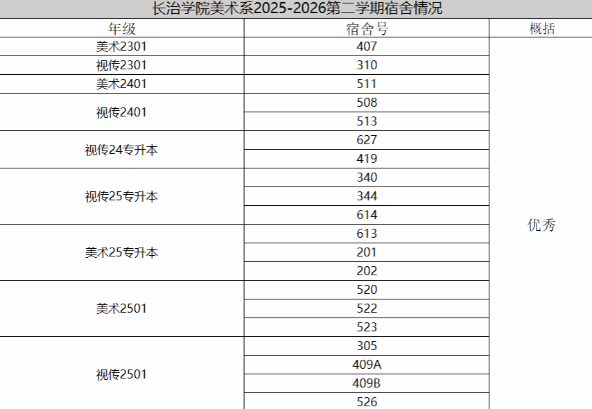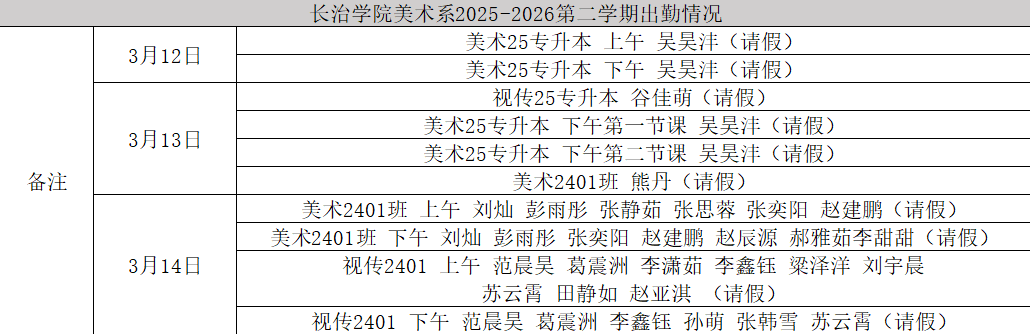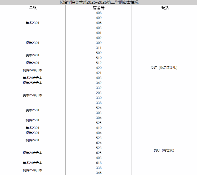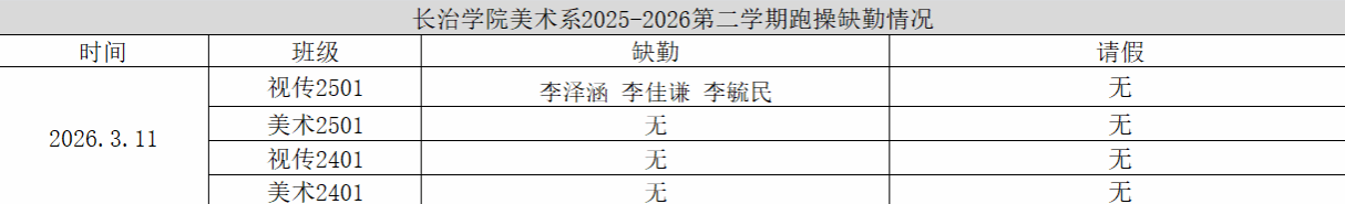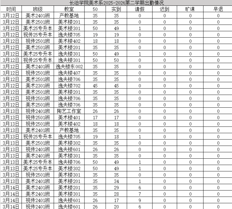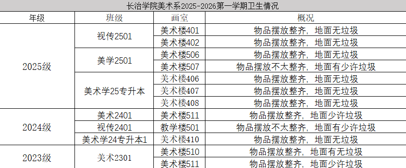 为进一步夯实我系学风建设基础,引导学生树立严谨的时间观念、锤炼优良的学习作风,美术系团委纪检部、学习部联合开展专项检查工作,重点核查统计各班上课出勤、教室卫生及宿舍情况,现将全面检查结果公示如下。