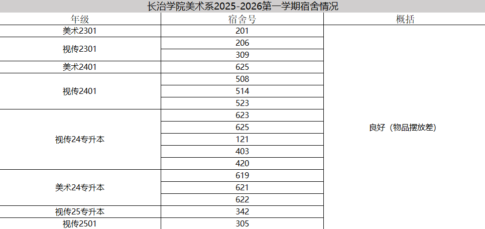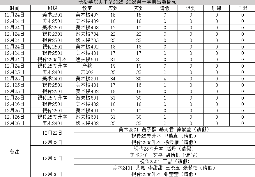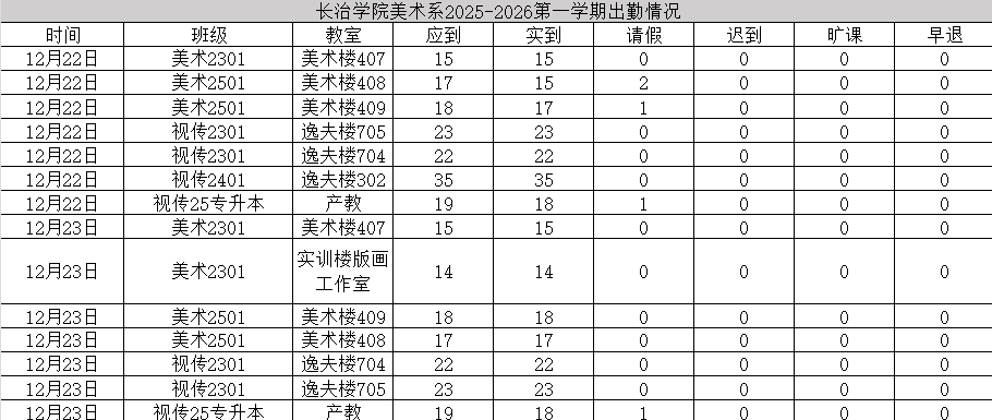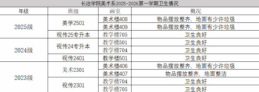 为进一步夯实我系学风建设基础,引导学生树立严谨的时间观念、锤炼优良的学习作风,美术系团委纪检部、学习部联合开展专项检查工作,重点核查统计各班上课出勤、教室卫生及宿舍情况,现将全面检查结果公示如下。
