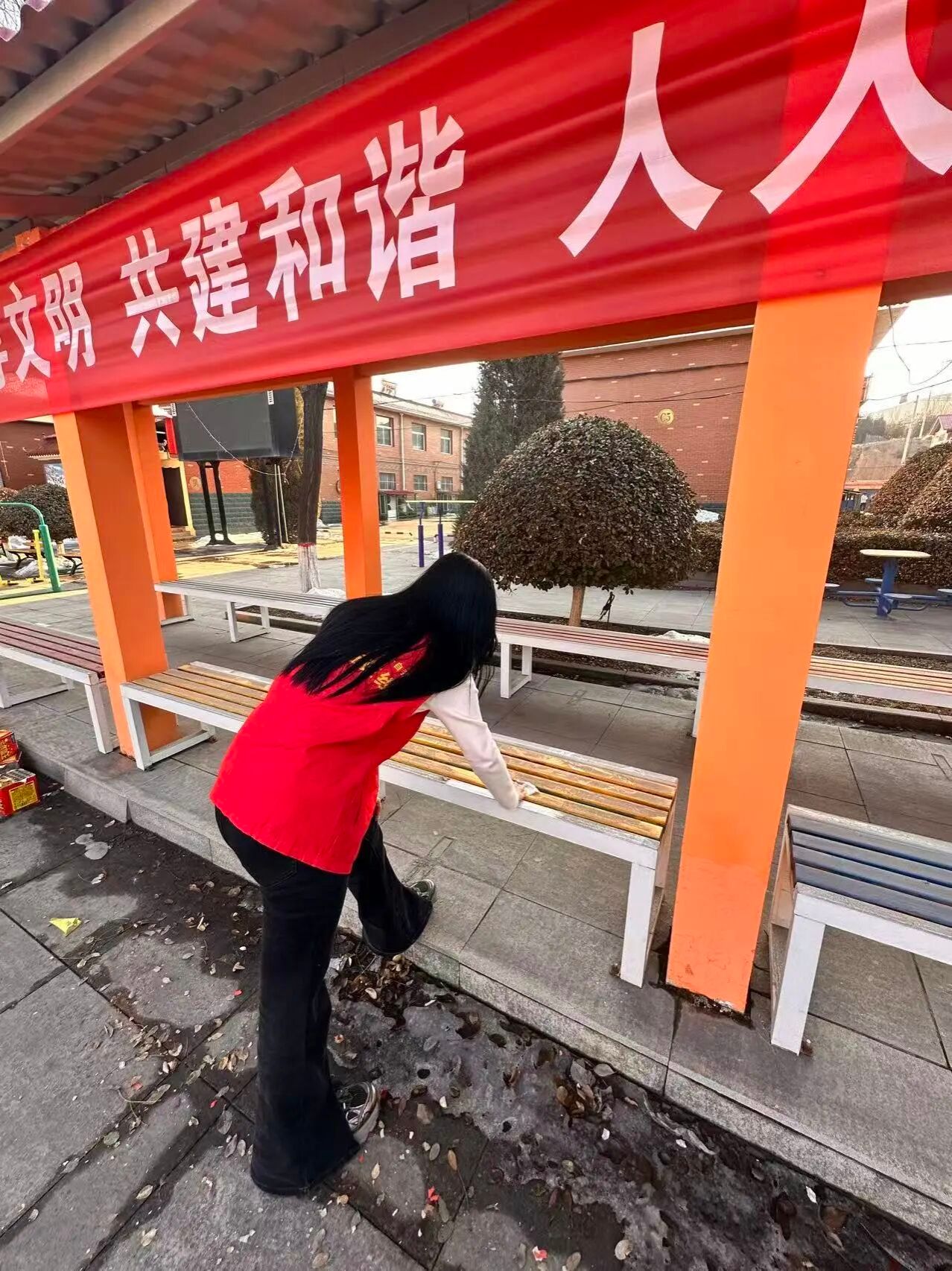 在社区的广场长廊,志愿者们拿起抹布扫帚,擦拭长椅、清理落叶。我们用美术生对“整洁”的执念,把公共空间打扫得焕然一新。抬头看见“共建和谐”的红色横幅,才明白文明不是抽象的标语,而是我们擦净的每一块污渍、摆齐的每一把座椅。